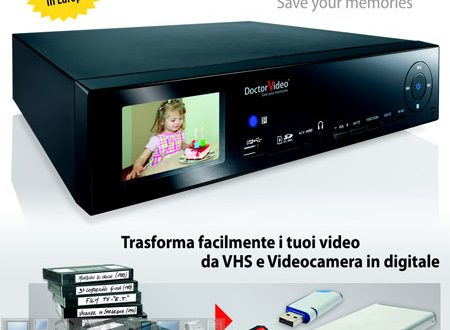 Dotato di uscite composite video e HDMI, Doctor Video è compatibile sia con le Tv attempate sia su quelle ad alta definizione. Ecco come funziona: Una volta finita la conversione non resta che l’imbarazzo della scelta: gustarsi l’anteprima di “ET” sul Tv piatto, guardarsi la prima puntata di “OK il prezzo è giusto” sul tablet o condividere la recita del proprio bimbo su Facebook. E quando avete fatto il pieno di nostalgia, Doctor Video si trasforma in normale lettore per riprodurre video da Hard Disk e periferiche USB e SD.
